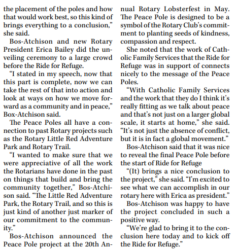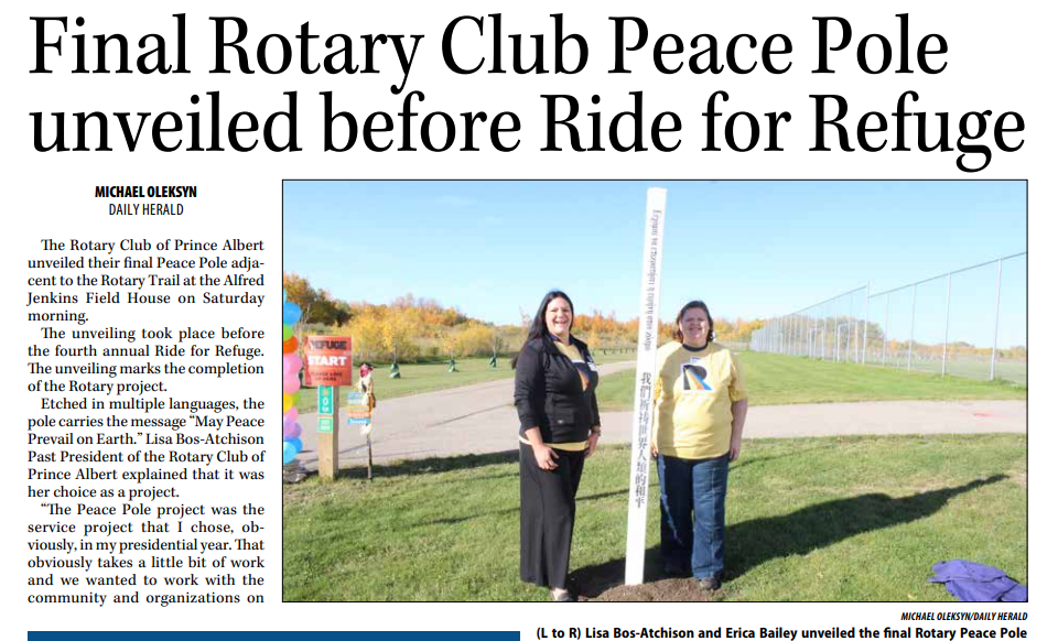 Thanks to our friends at the PA Daily Herald for the following article on our fourth Peace Pole installed in Prince Albert. Can you find all four locations?? For more information on Peace Poles - Peace Building - Rotary World Peace Pole